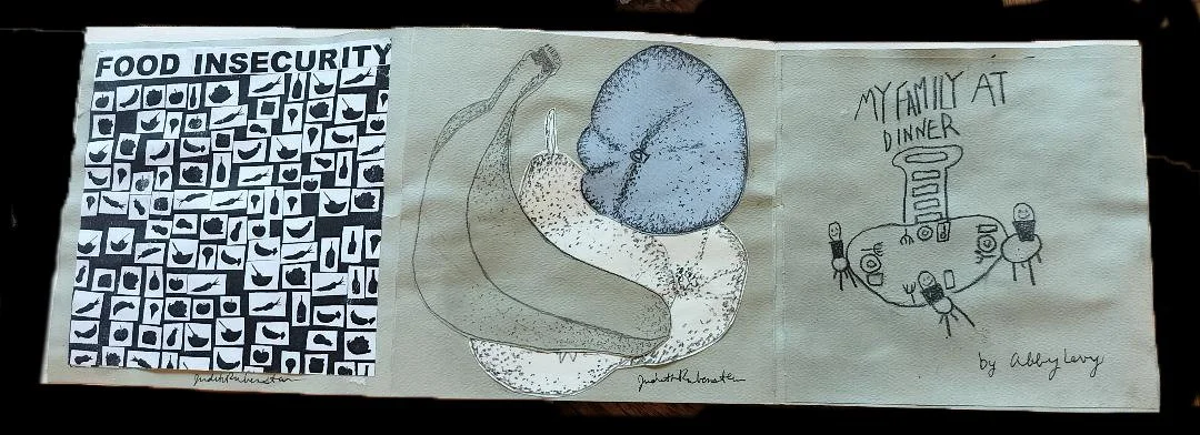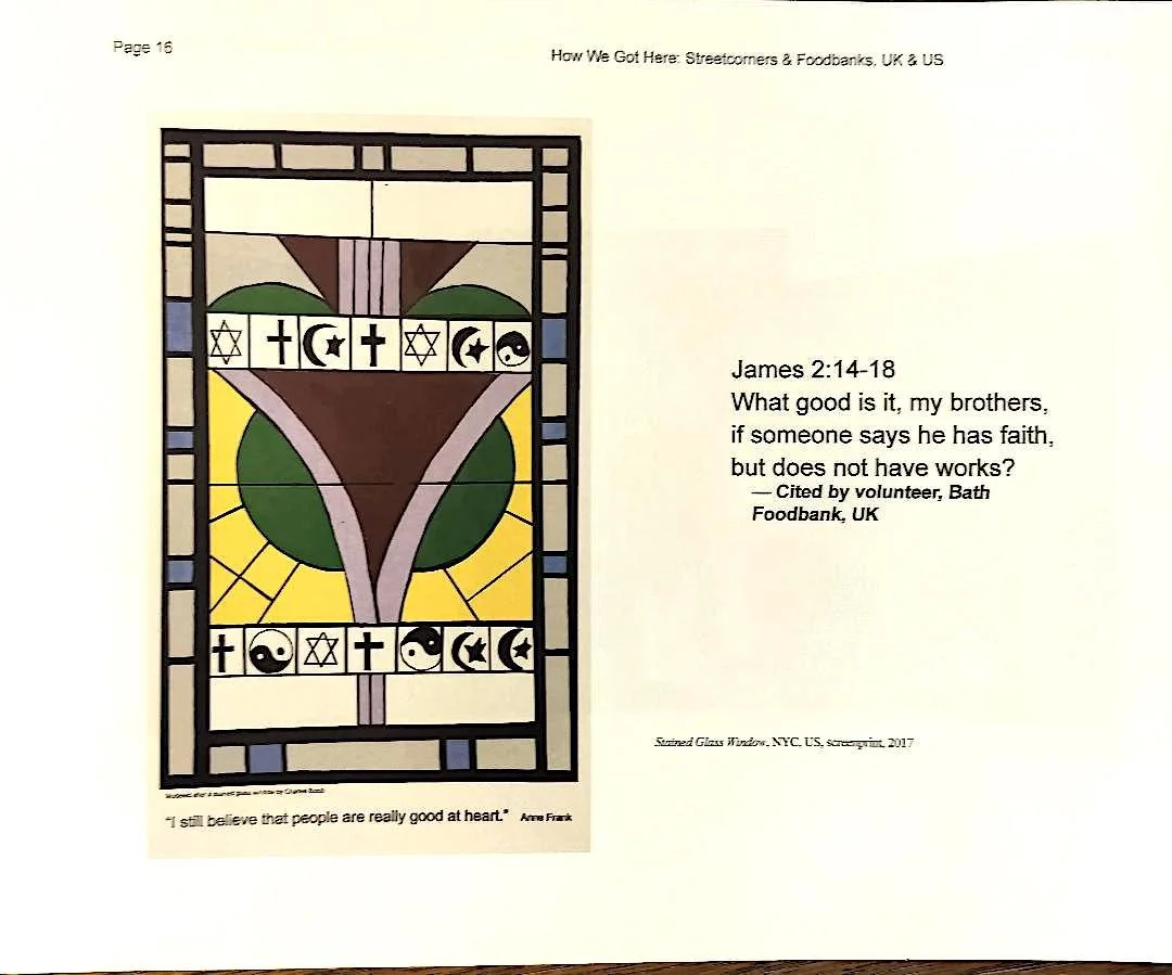 It contains my artwork done as I toured the food-banks of the United Kingdom under a Rosen Foundation fellowship, and as I worked in the soup kitchens of NYC for the past decades. Text was gathered from food-bank volunteers and customers answering my question, “How did you get to be on this corner, needing food charity, or being a volunteer dispensing the stuff?” The booklets were distributed to the participating food banks (the UK word) in the UK, and food pantries (the US word) in NYC.