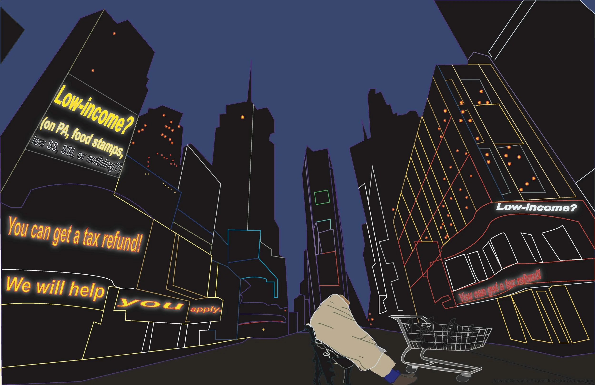 My artist volunteers and I hung 100 or so beautiful 18” X 24” posters all over the city. These directed the poorest of the poor to participating soup kitchens to apply for a tax credit due them by dint of their living in NYC all year, despite having earned little or no income. A Seedtime Fund grant subsidized the artists and paid for the printing of 120 posters.