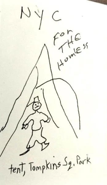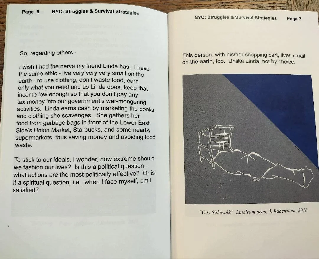 The form the booklet takes is a narrative of my rambling around NYC, describing, in my words and my artwork, New Yorkers who are struggling.